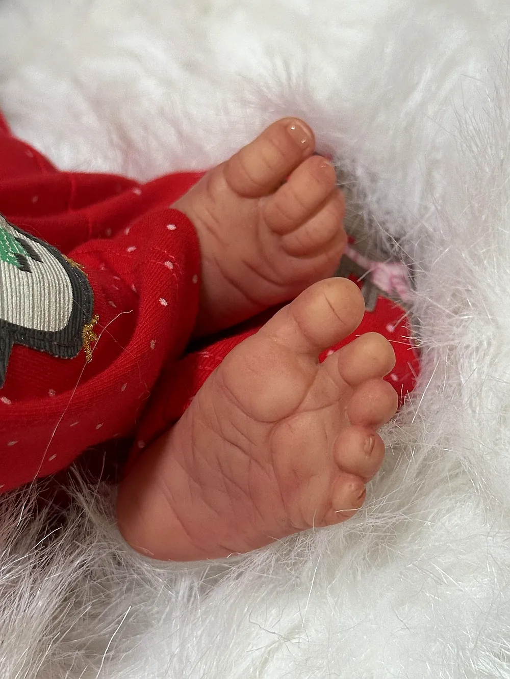 • Mottled skin with the appearance of tiny capillaries, blemishes, milia and a tiny scratch tipped and sealed nails